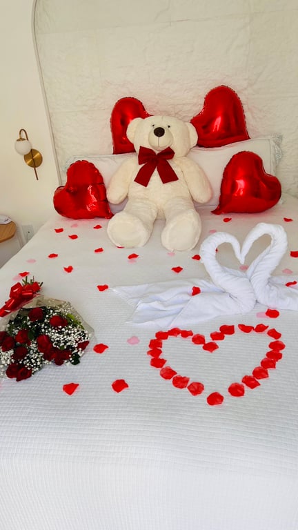 O Pacote Ouro inclui: urso de pelúcia, buquê de flores, champagne, tábua de frios, cisne de toalhas, pétalas de rosas e balões em formato de coração.